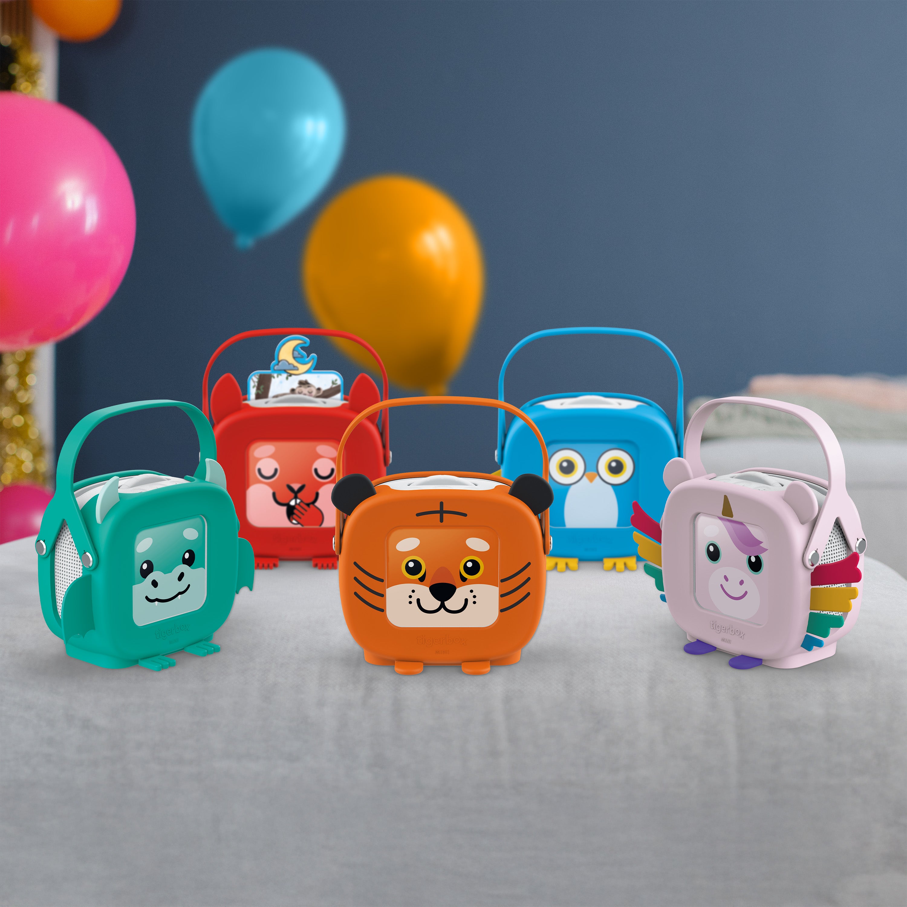 Tiggi Tiger, Henny Hörnchen, Elphi Einhorn, Kalli Kauz und Dino Drache sind nicht nur super Begleiterinnen und Begleiter, sondern auch praktische Tragehüllen für die tigerbox MINI. Mit weichem Silikon und praktischem Griff, bieten sie besten Schutz und sind immer bereit für das nächstes Abenteuer.
